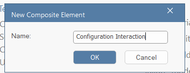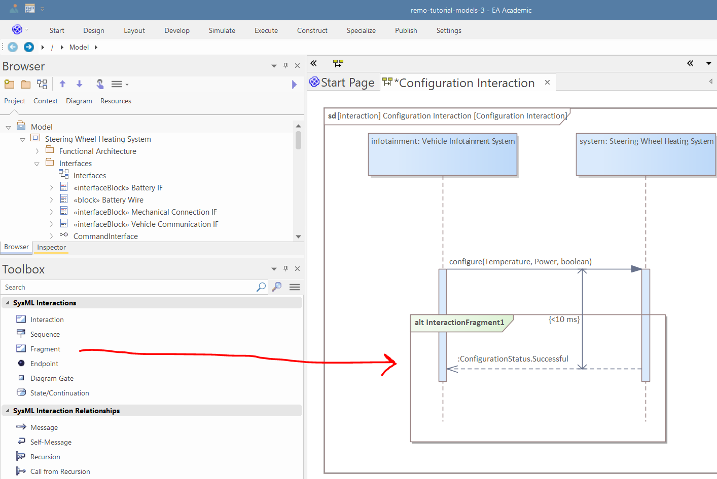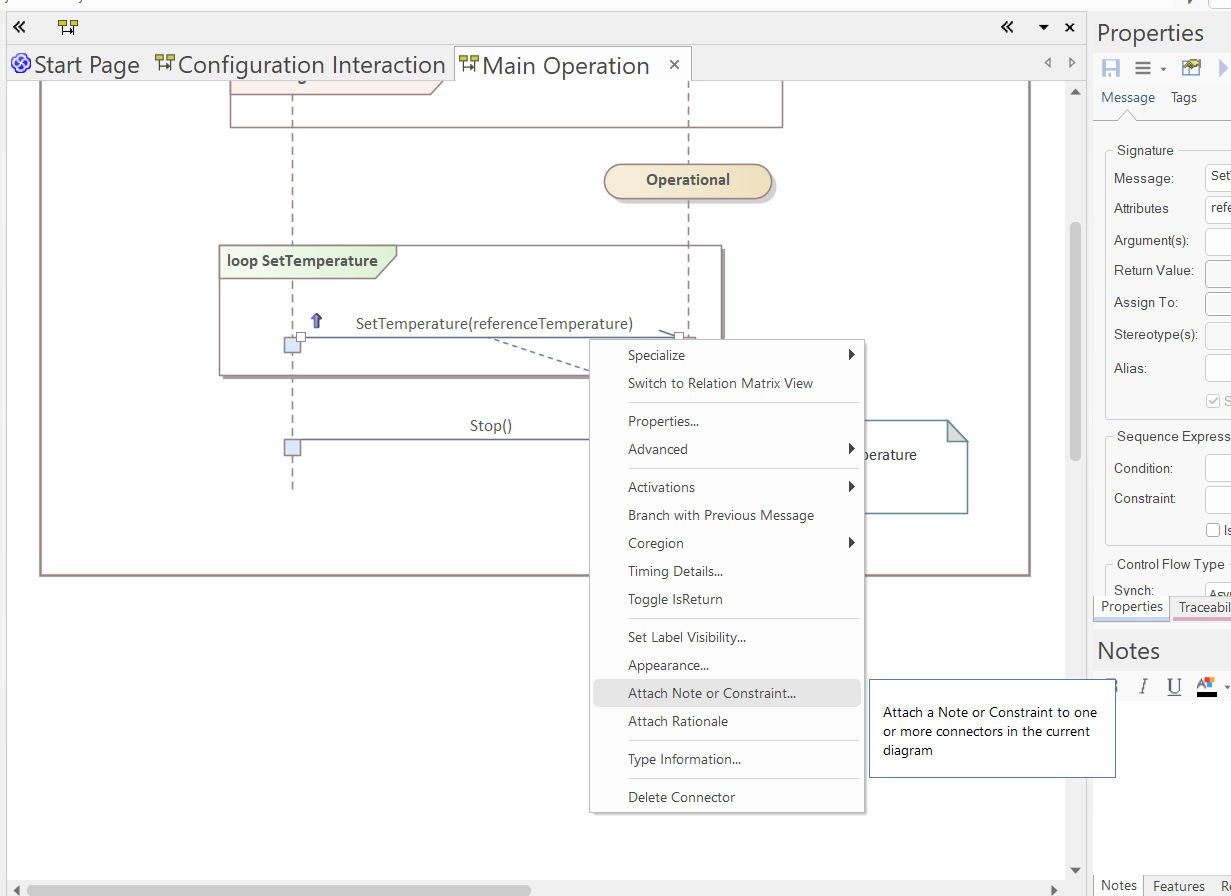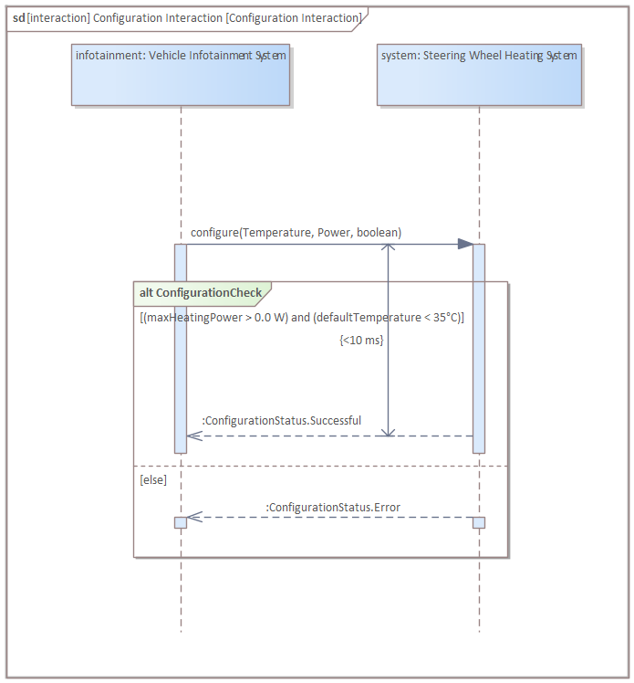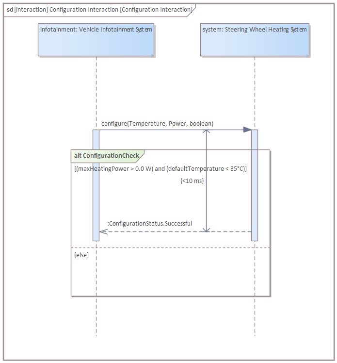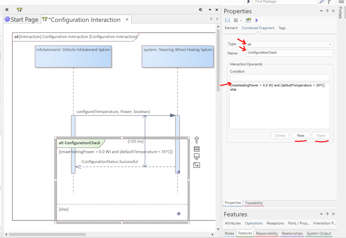 Select the fragment. In the "Combined Fragment" tab of the Properties window, set the type to "alt", set the name to "ConfigurationCheck", and press "Save" (pressing "New" in the Interaction Operands before pressing Save can reset the name). Add a new condition "(maxHeatingPower > 0.0 W) and (defaultTemperature < 35°C)", and press "Save". Thereafter, create another condition by pressing "New" and set the condition to "else", and press "Save" (the new condition will appear in the list only after clicking "Save", not instantly after "New"; "New" basically makes sure that no condition is selected, but the actual addition is done by saving):