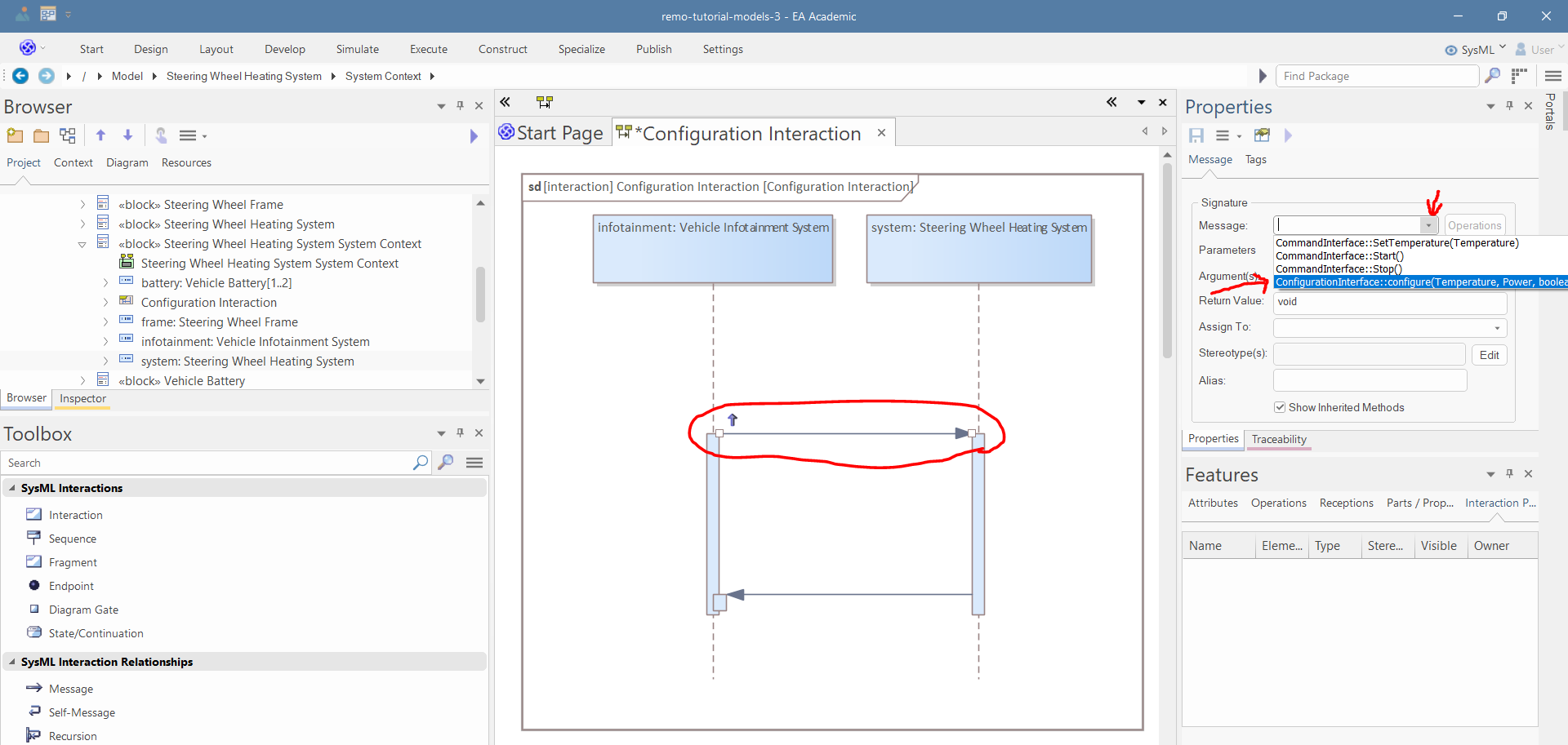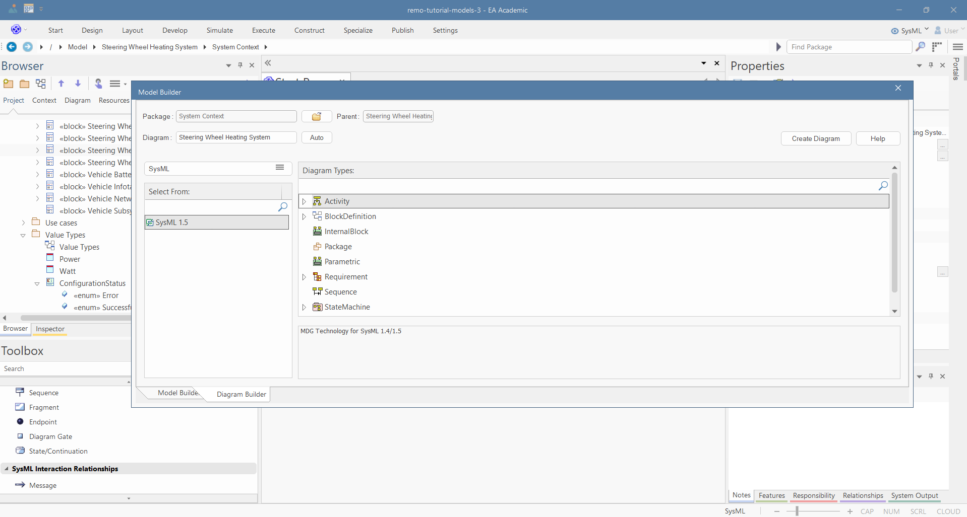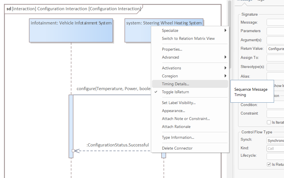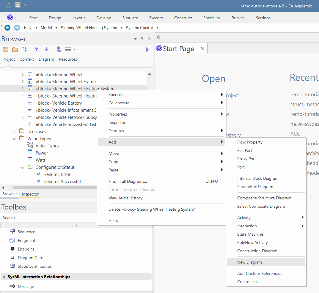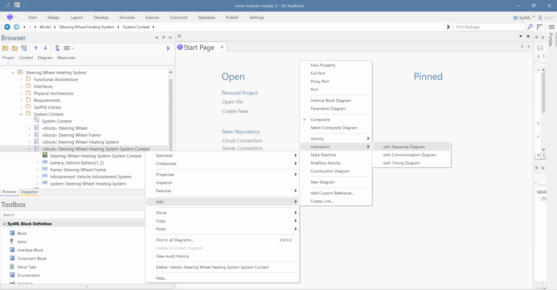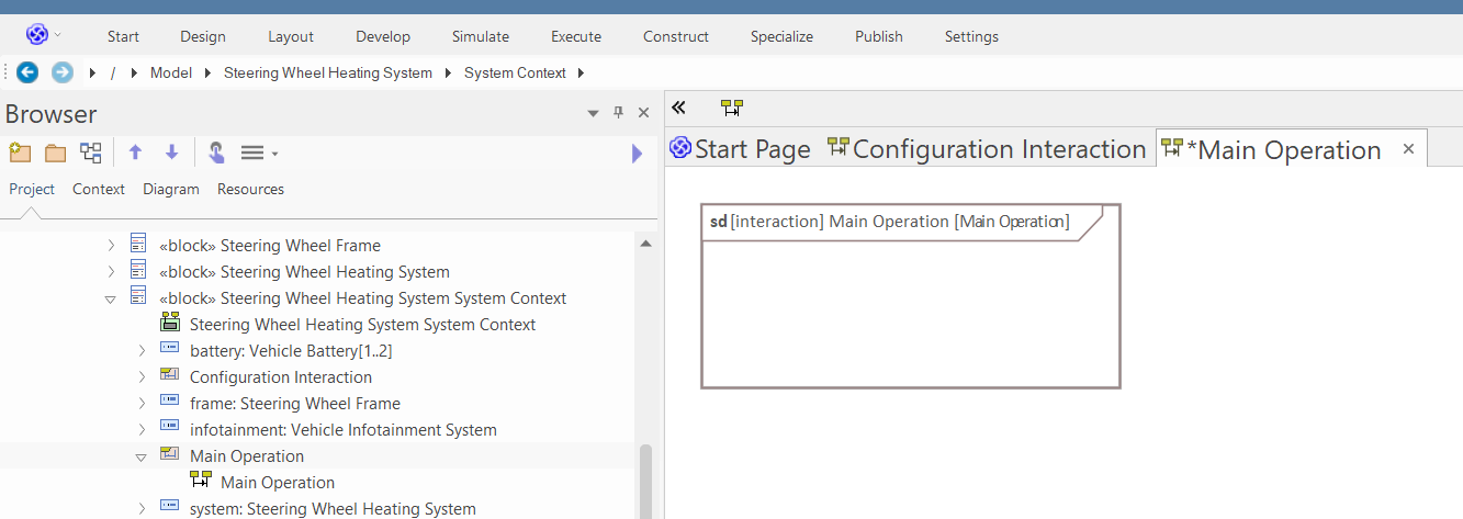 Right click on the "Steering Wheel Heating System System Context" and select "Add/Interaction/with Sequence Diagram":
