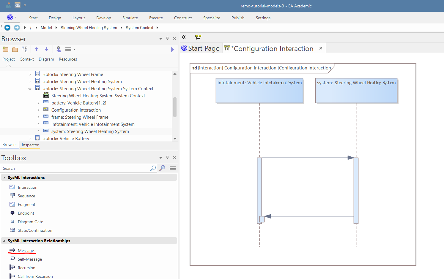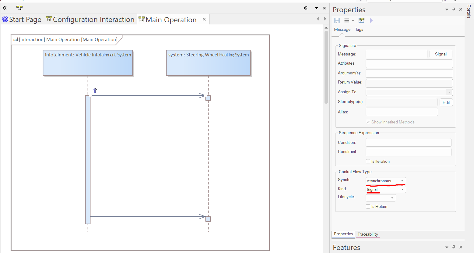 Drop the system and the infotainment parts into the diagram as links and create two messages the following way: