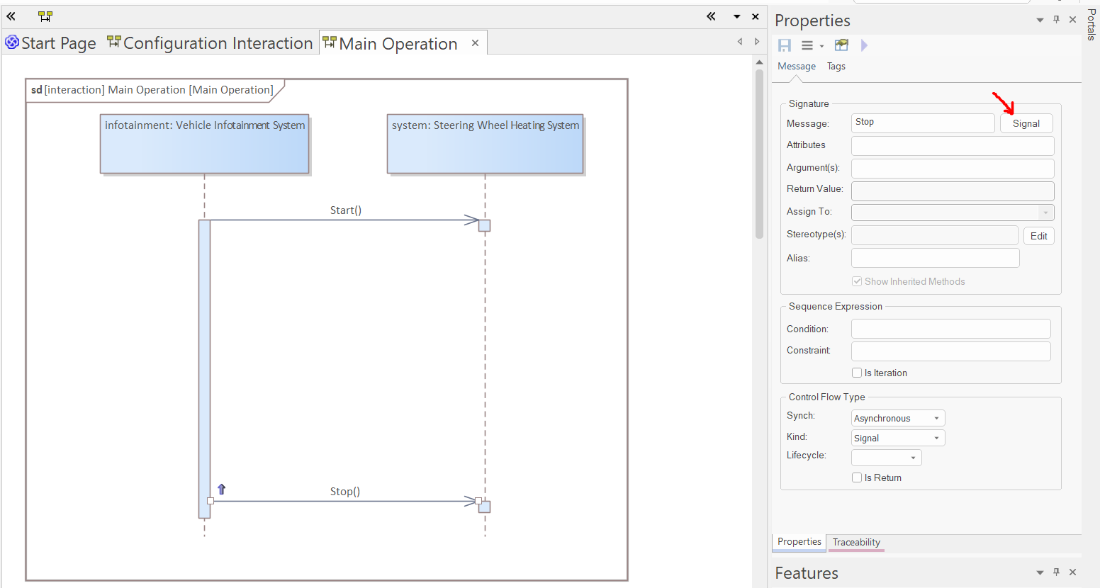 In the Message field of the properties window, select the signals "Start" and "Stop" (from the "Interfaces" package) for the two messages: