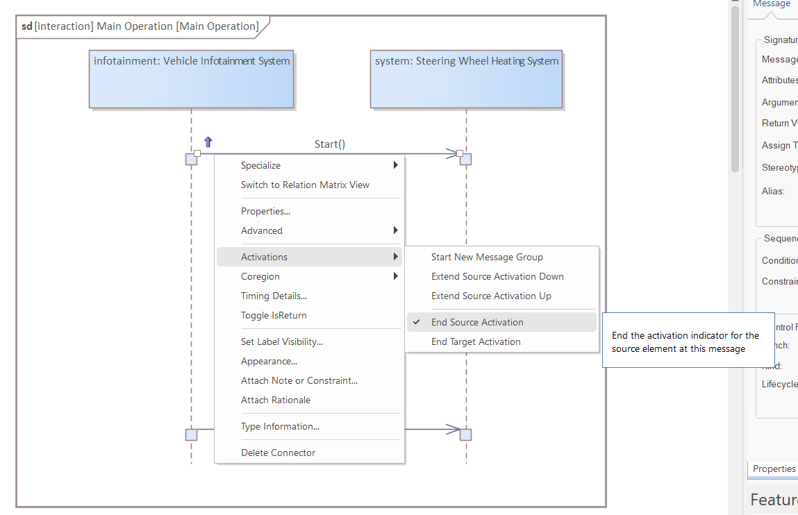 - Changing the source/target of a message by dragging the ends can be difficult as EA often starts moving the lifeline instead of the message end. Use right-click/Advanced/Set Source and Target instead.