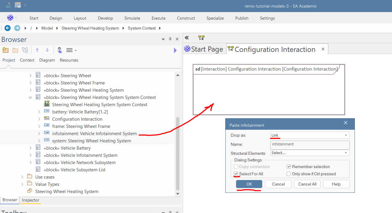 Drag and drop the "system" and "infotainment" part properties into the diagram as links, then press OK.