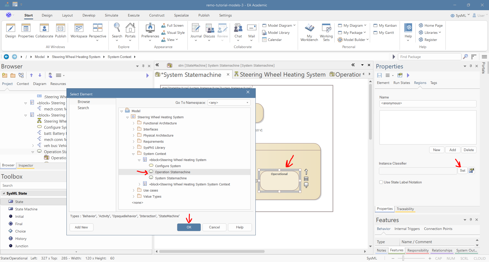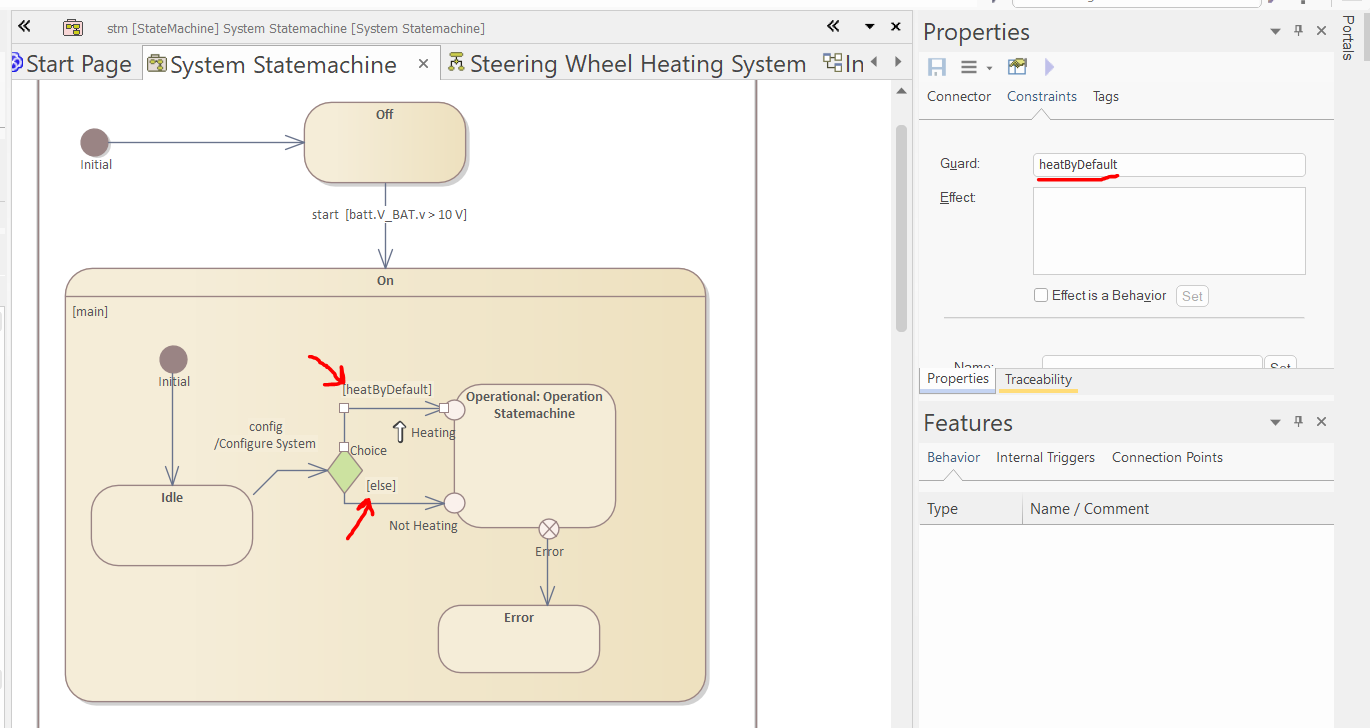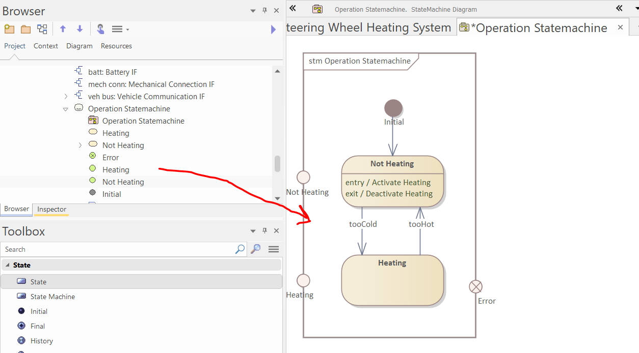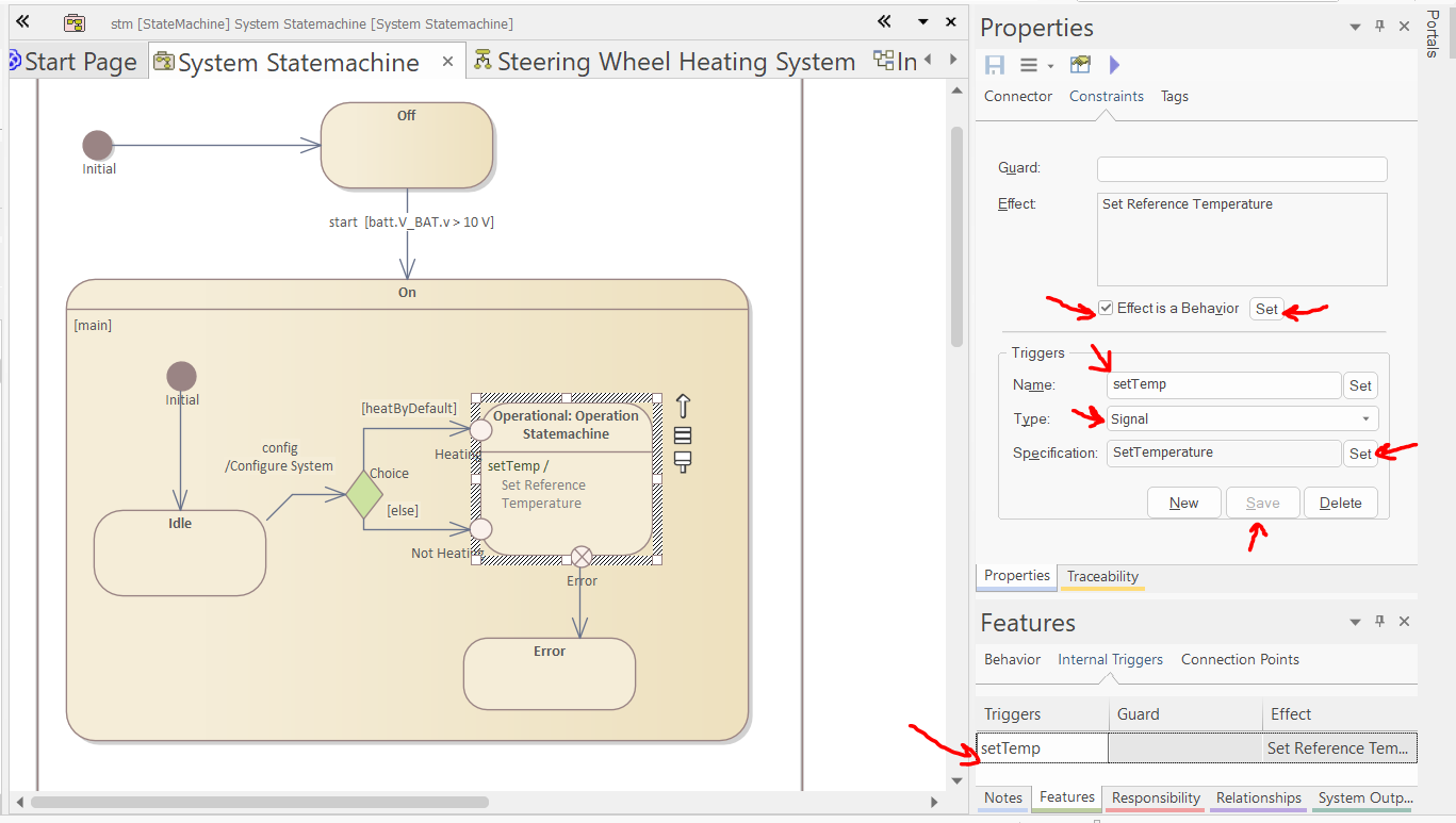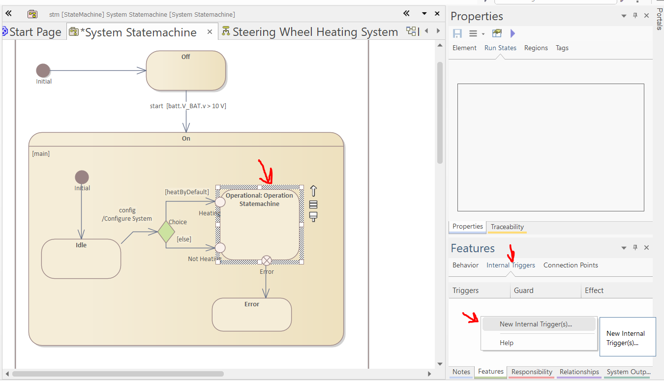 Select the "Steering Wheel Heating System" block, and set "System Statemachine" as its Classifier Behavior in the Properties window.