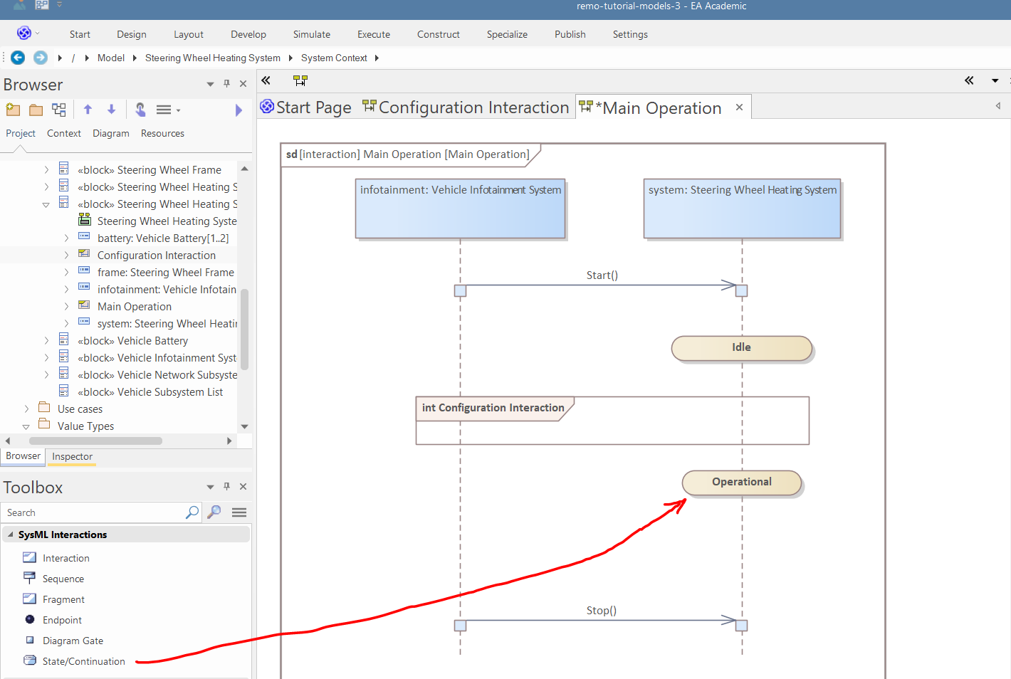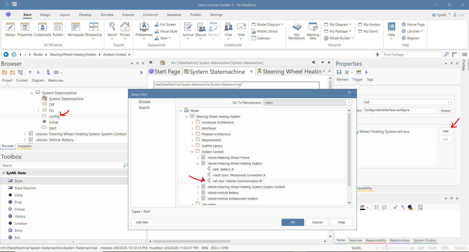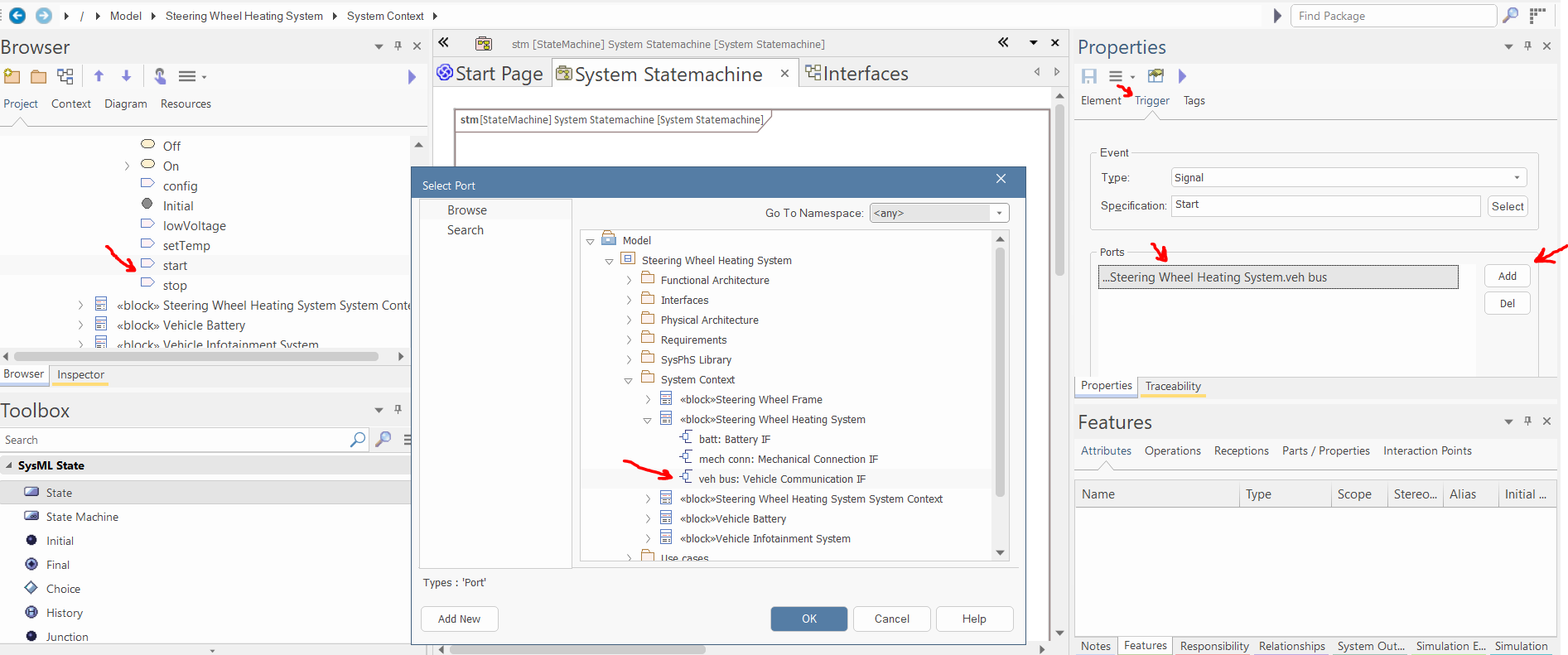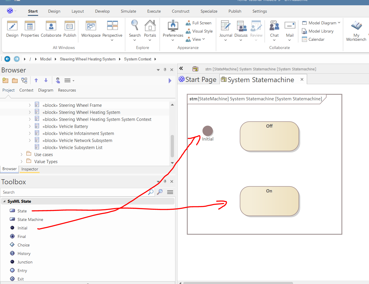 Select the "Steering Wheel Heating System" block, and set "System Statemachine" as its Classifier Behavior in the Properties window.