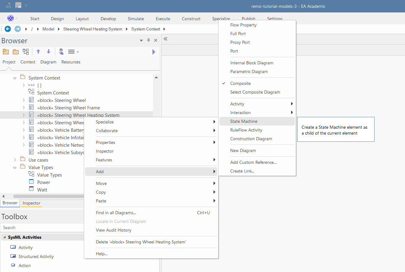 Right click on the "Steering Wheel Heating System" and select "Add/Statemachine", name the statemachine to "System Statemachine" and click OK: