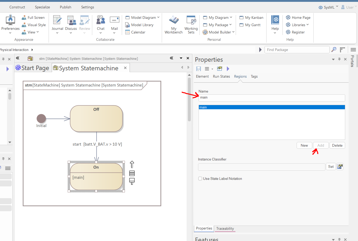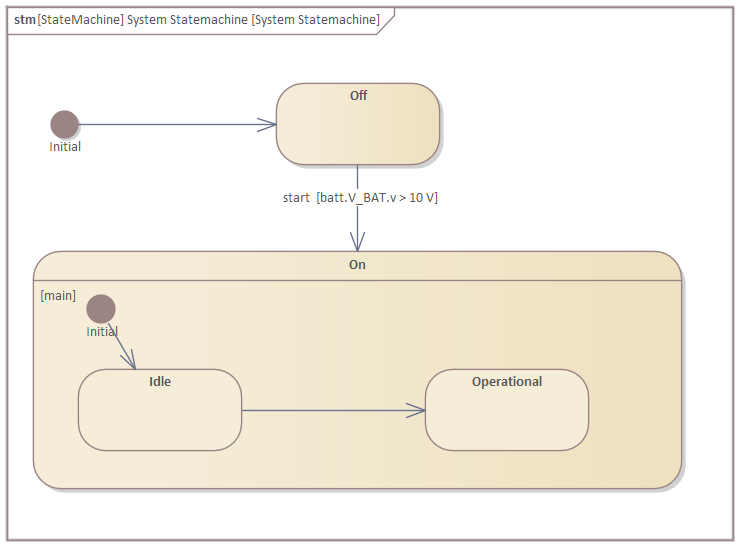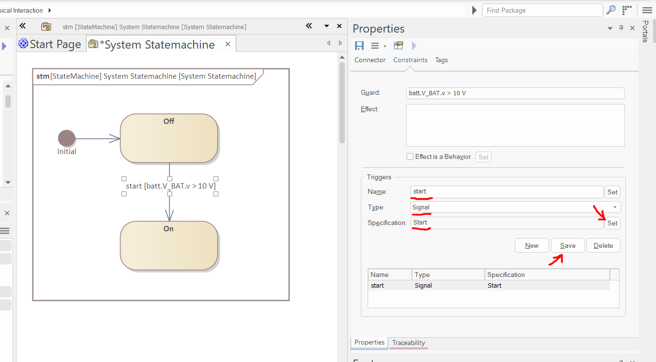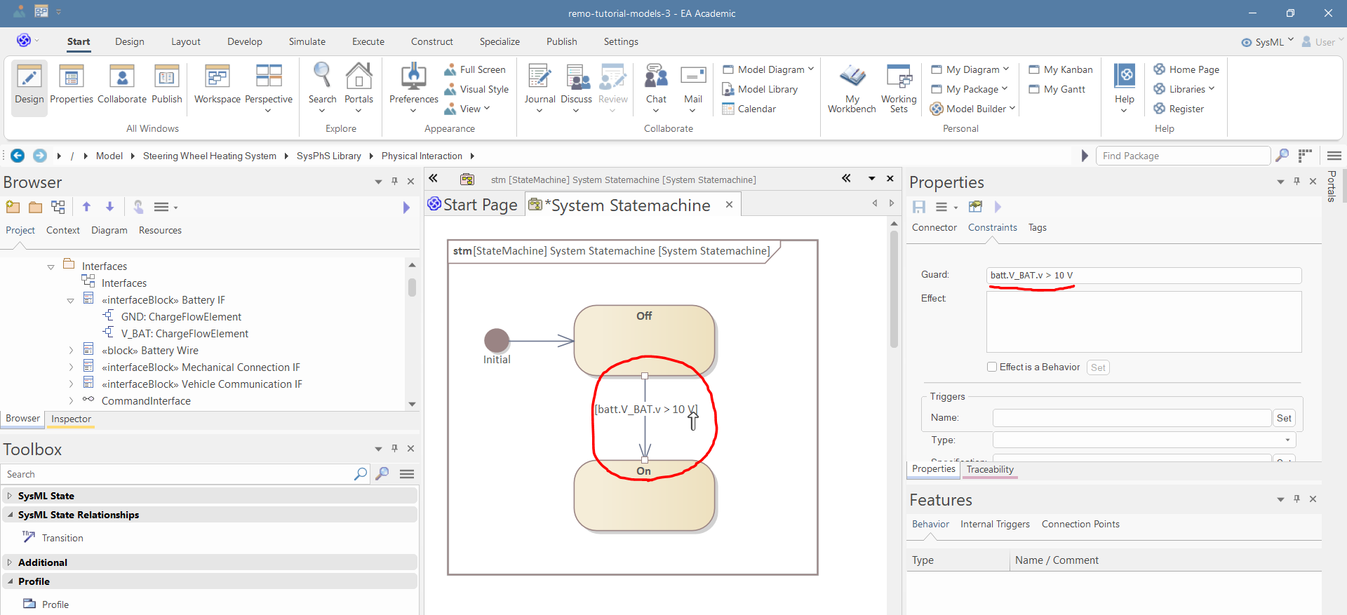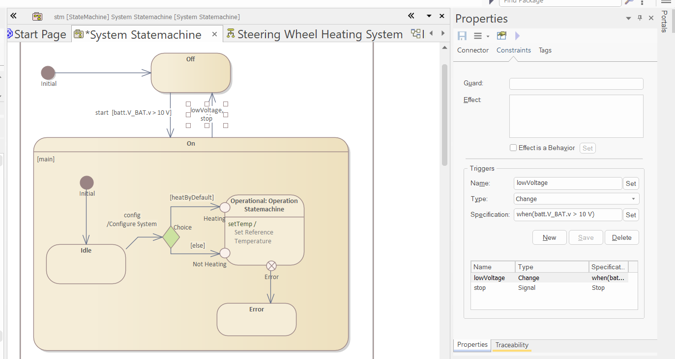 Select the second transition (between On and Off states), and in the "Constraints" tab of the Properties window, set the guard to "batt.V_BAT.v > 10 V":