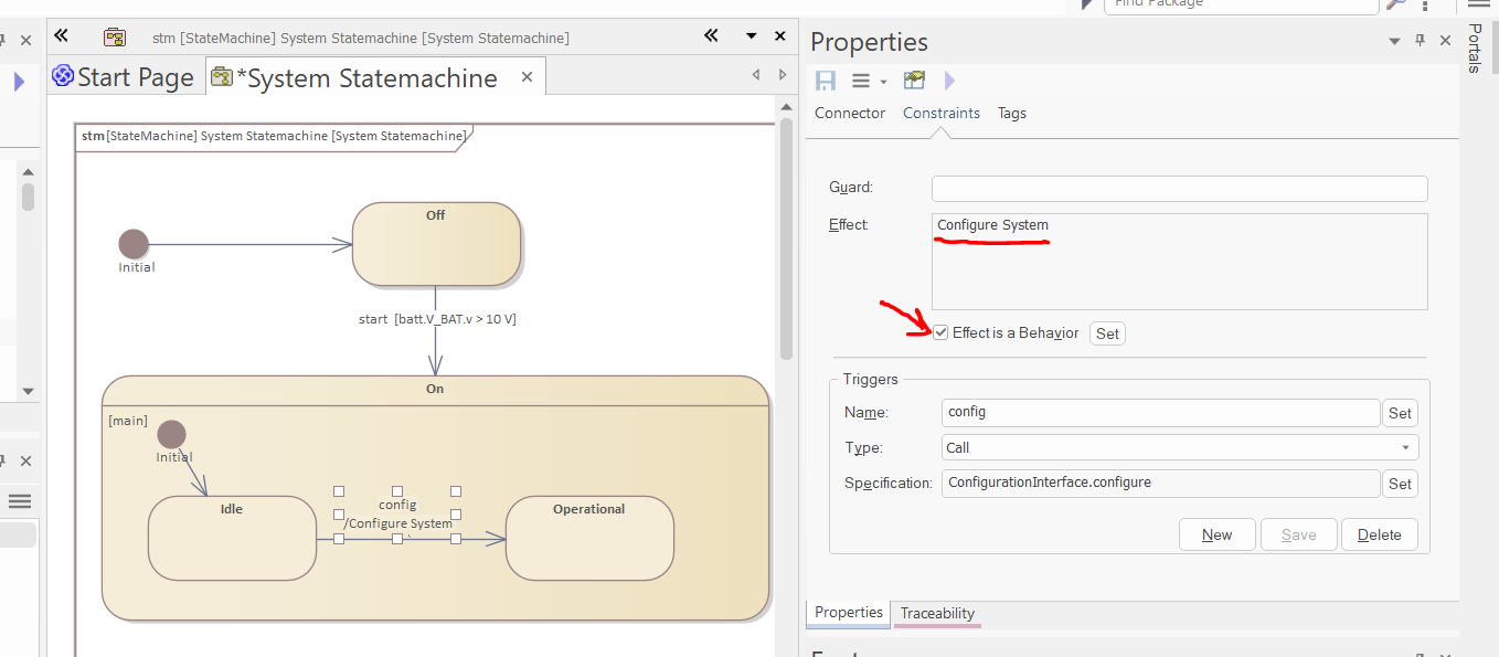 Select the effect is a behavior checkbox, and select the "Configure System" activity (created in the previous part of this tutorial as an activity of the Steering Wheel Heating System) as an effect: