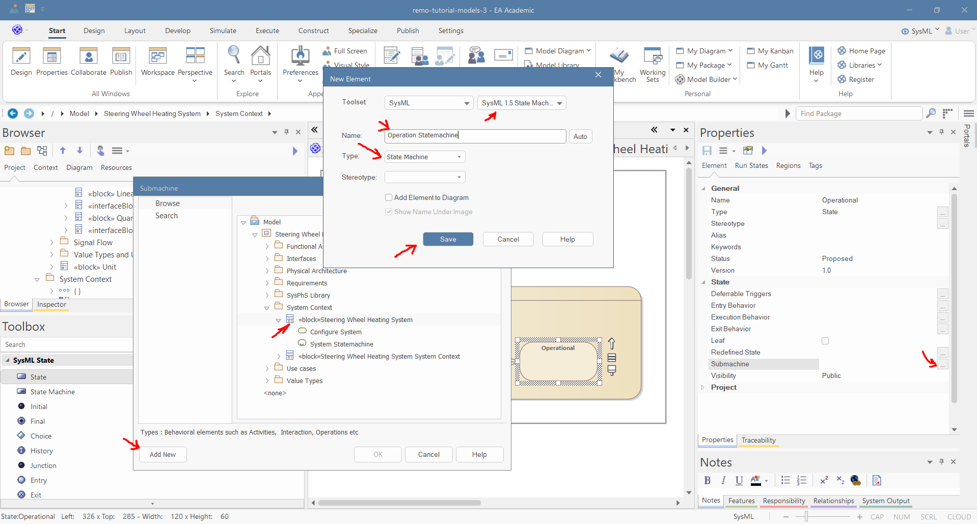 Select the "Operational" state and in the properties window select the "Submachine" behavior of the state. Thereafter, in the pop-up window, select the system and click "Add New". Set the name to "Operation Statemachine" and the Type to "State Machine", and click "Save":