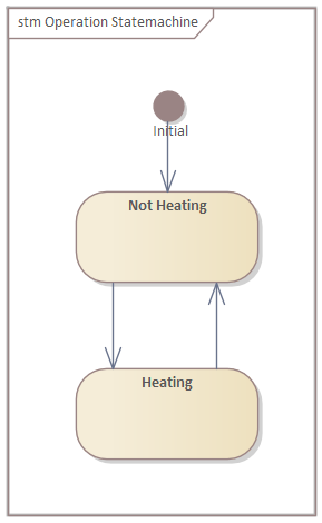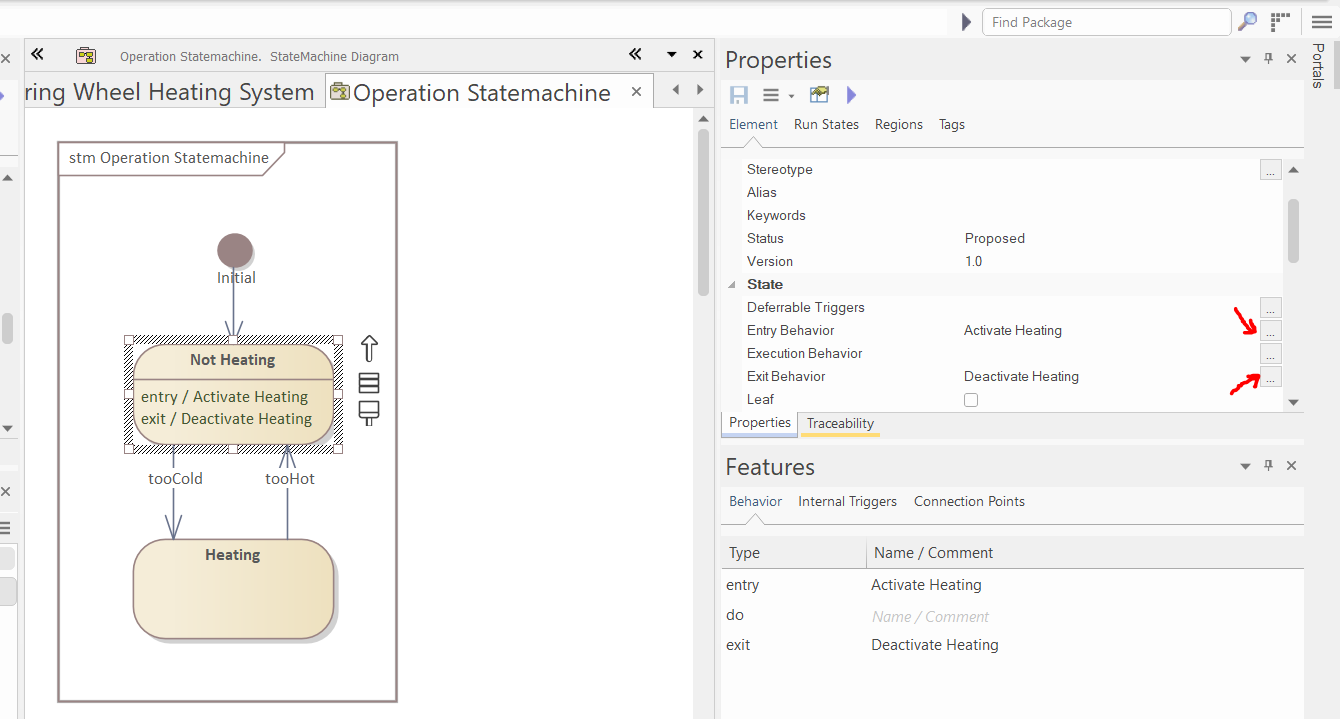 Select the "Heating" state and in the properties window set the entry and exit action to "Activate Heating" and "Deactivate Heating" activities, respectively: