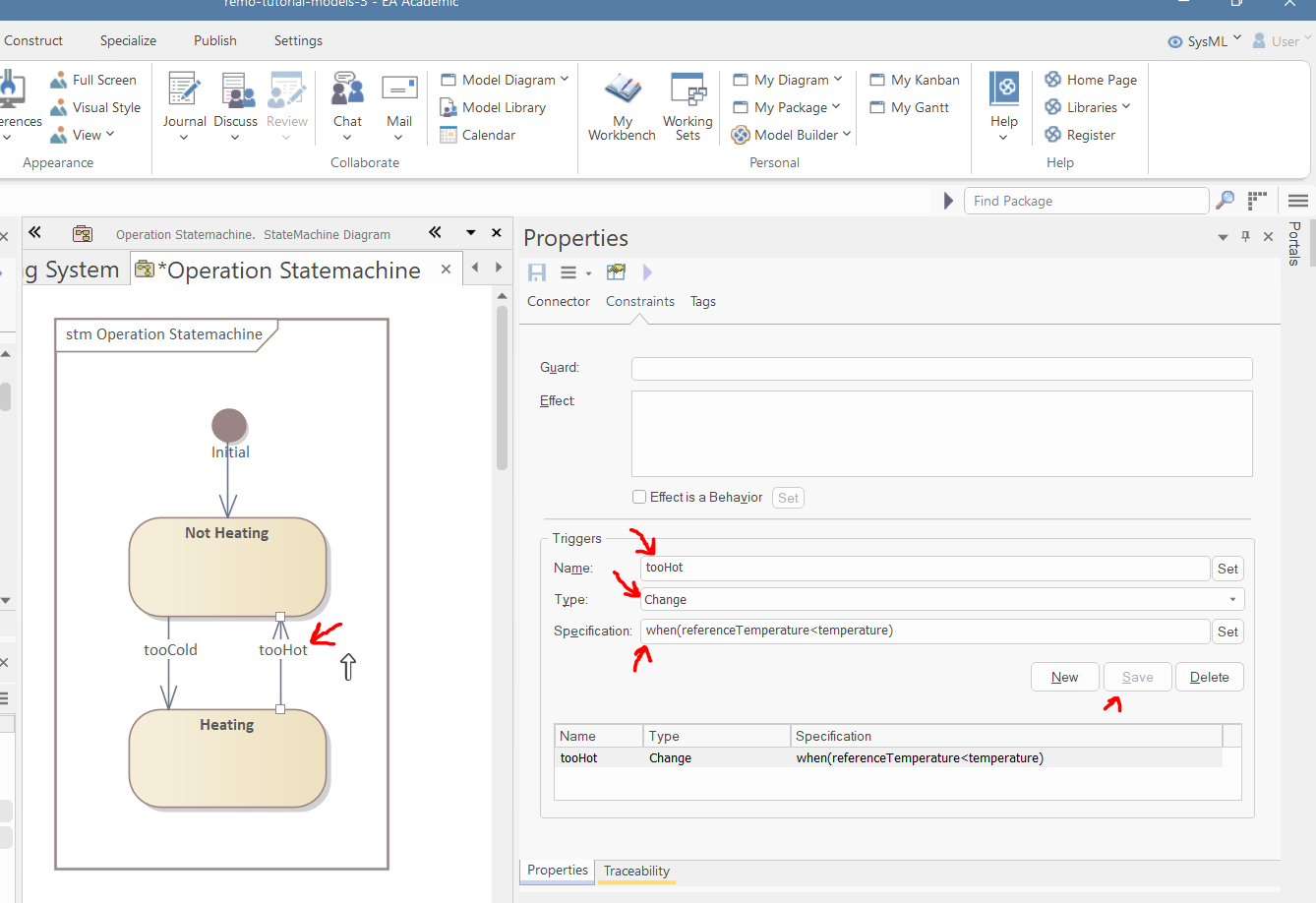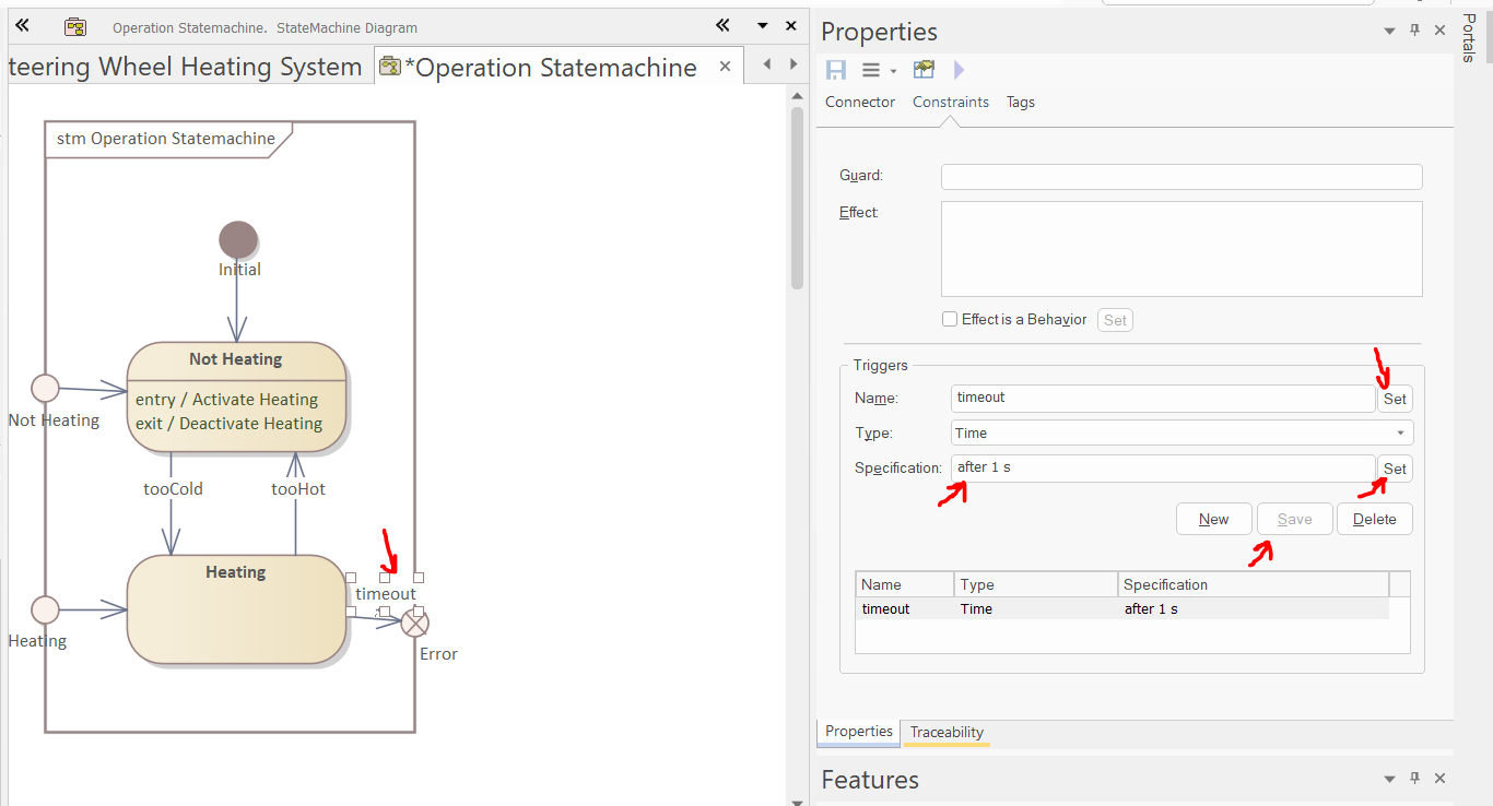Thereafter, in the Triggers section of the "Constraints" tab of the Properties window, create a new trigger (just like before in the case of Combined Fragment conditions, the "New" button does not add a new trigger to the list yet; it appears after pressing "Save"):