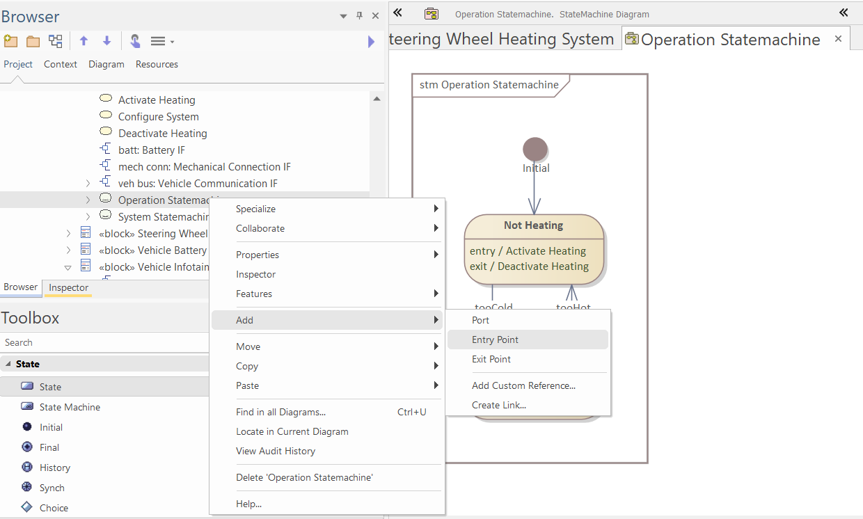 In the browser, right-click the "Operational Statemachine" and select "Add/Entry Point":