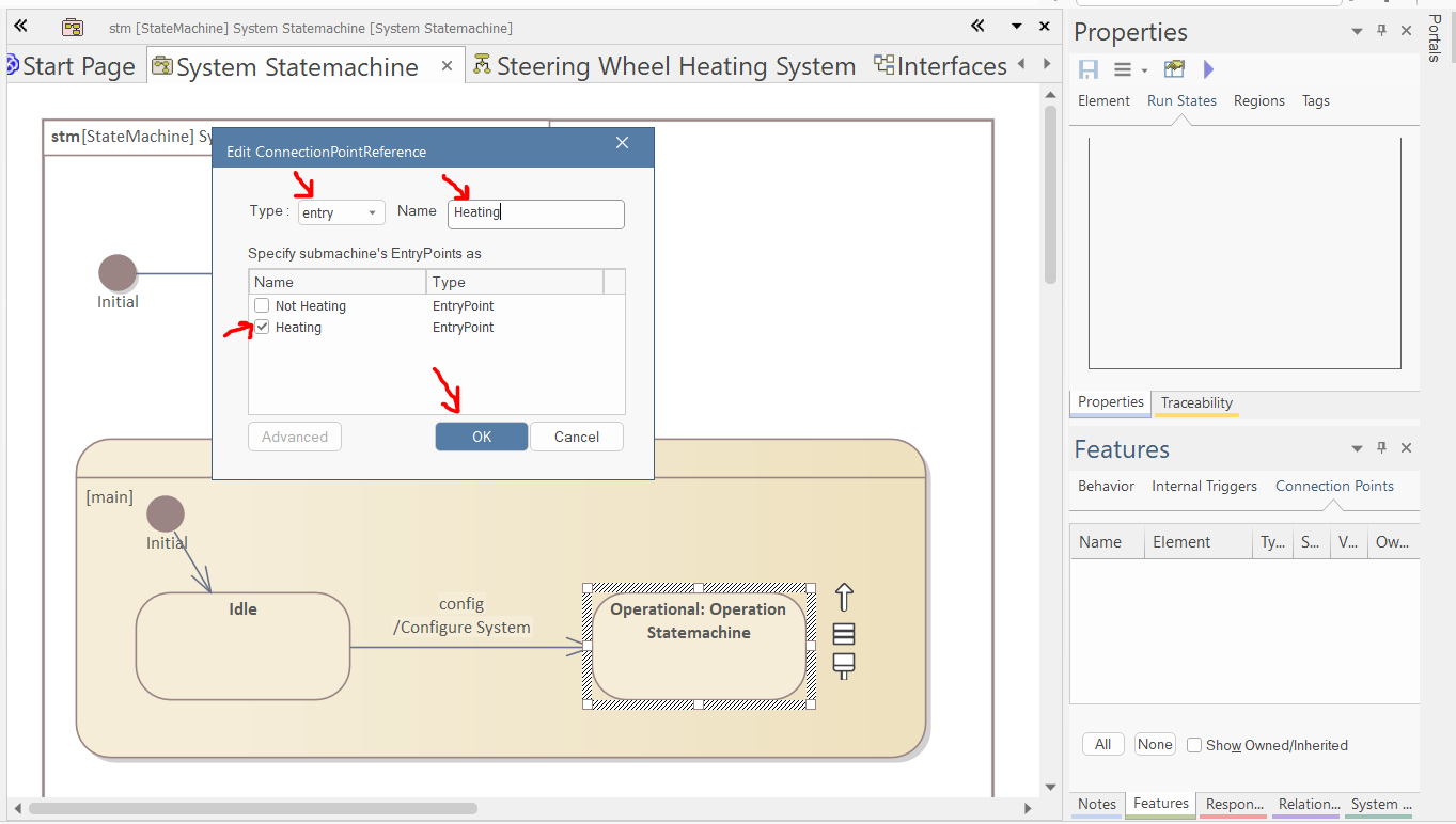 Open the "System Statemachine". Select the "Operational" state. Right-click in the "Connection Points" tab of the Features window and select "Add New". In the pop-up window, select the "Heating" entry point, name the reference to "Heating", and click "OK".