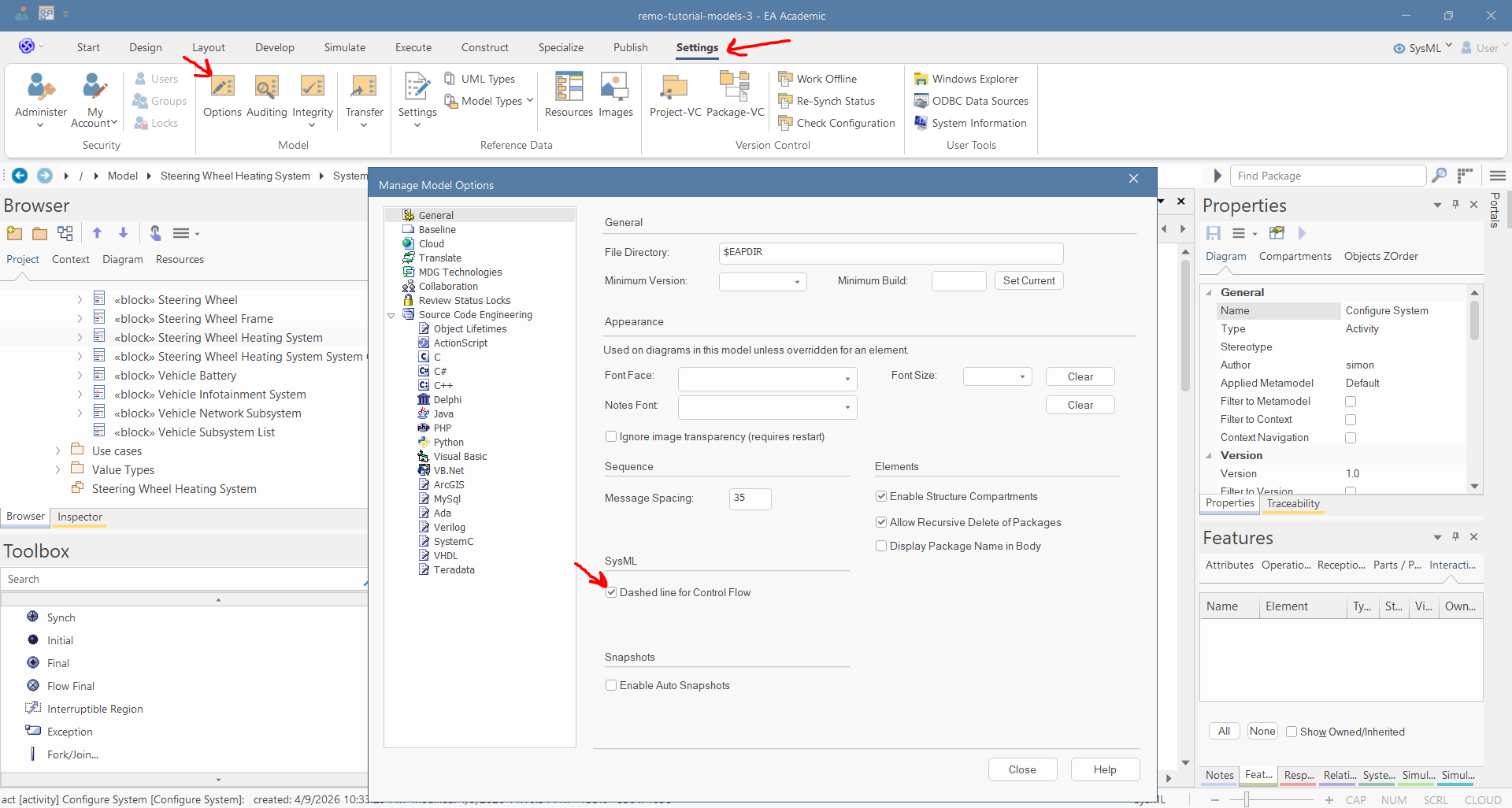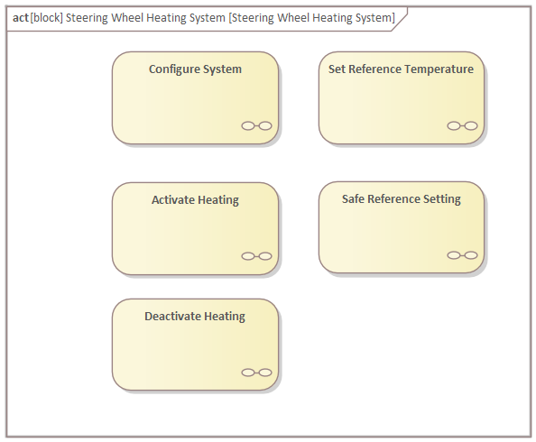 This section shows you how you can create activity diagrams. In this tutorial, we will create activities for the "Steering Wheel Heating System".