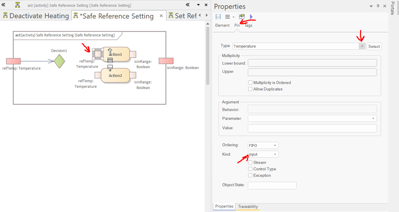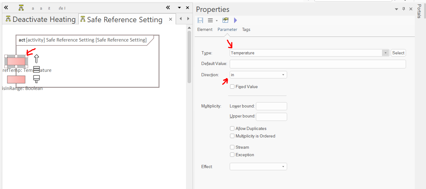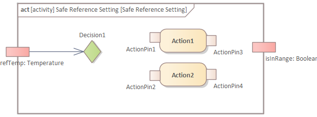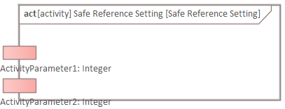 Open the diagram of the "Safe Reference Setting" and use the "SysML Activities" toolbox page to create two parameters (if EA doesn't let you create them directly on the left side of the border, create them on other parts of the border and move them):