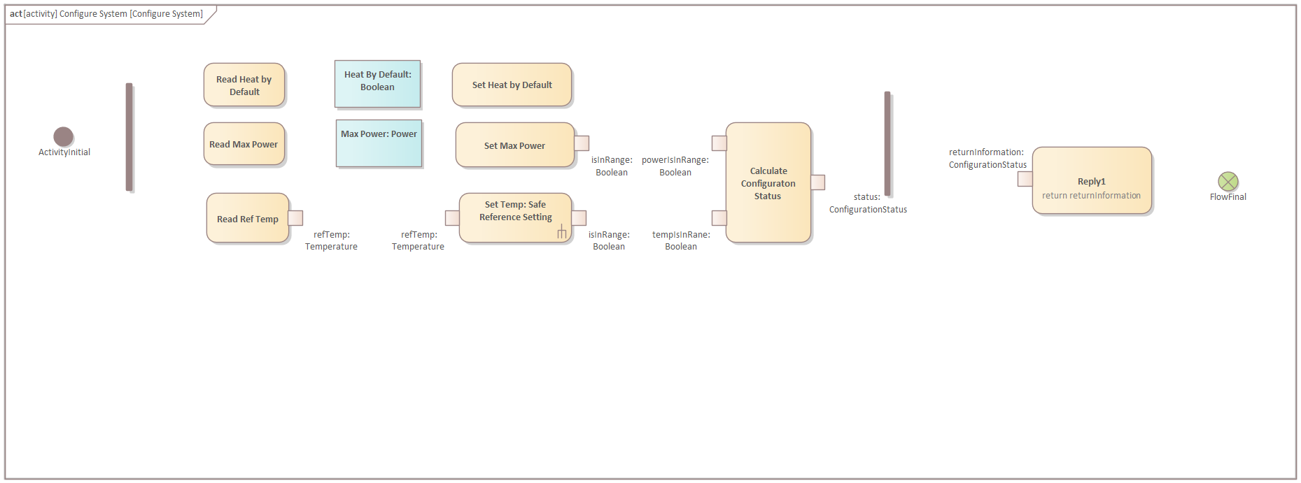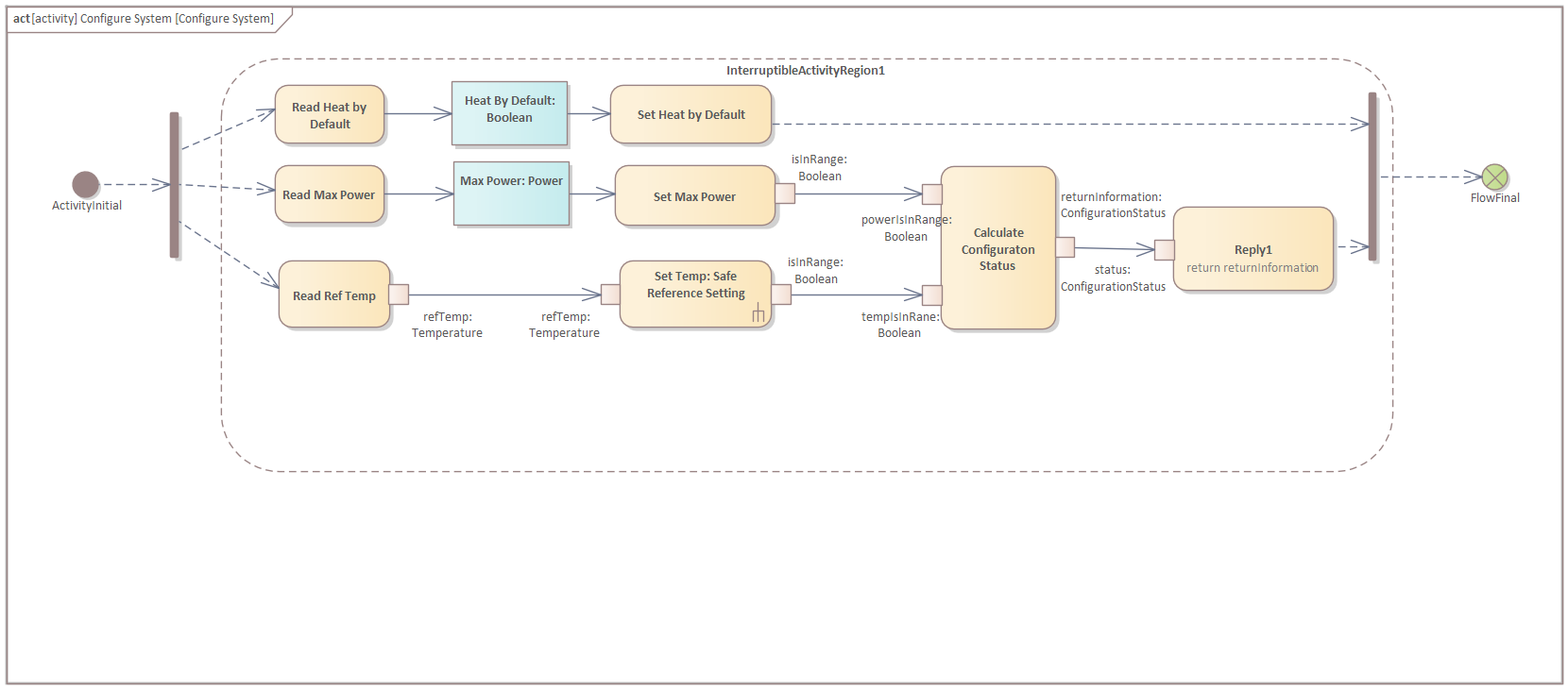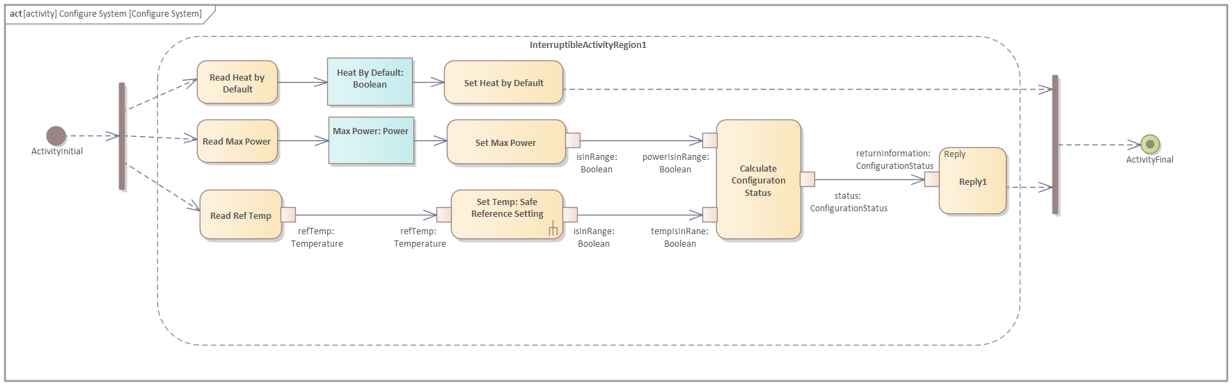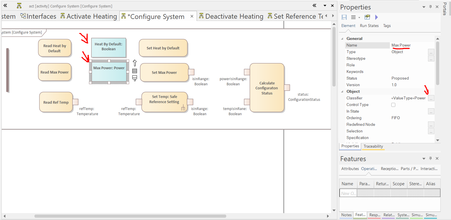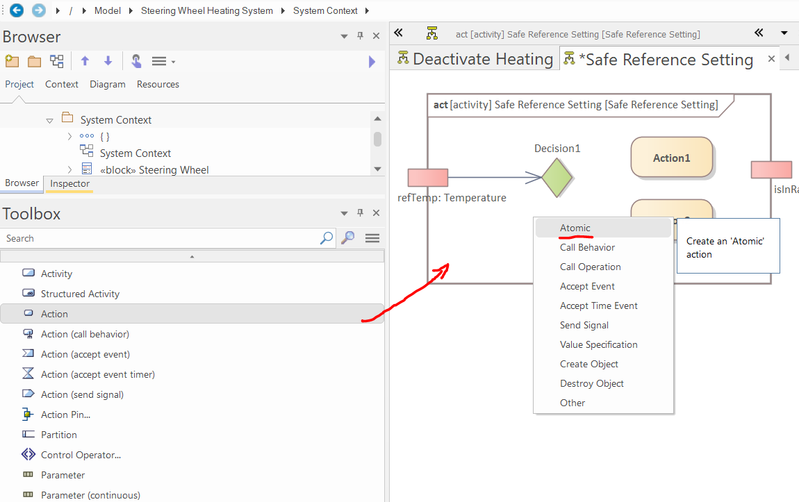Use the "SysML Activities" toolbox page to create five Structured Activities (in the pop-up window select other and in the other pop-up window select "Simple Compos..."), namely, "Configure System", "Set Reference Temperature", "Activate Heating", "Deactivate Heating", and "Safe Reference Setting".