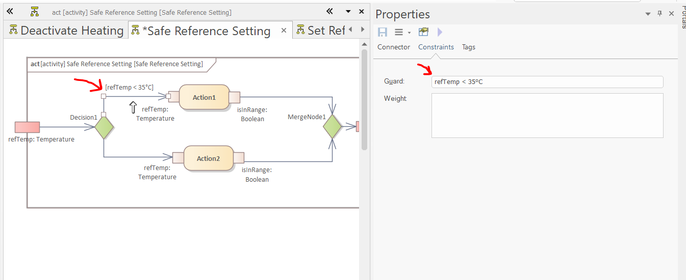 Define the guard of the incoming flow of "Action 1" in the "Constraints" tab of the "Properties" window: