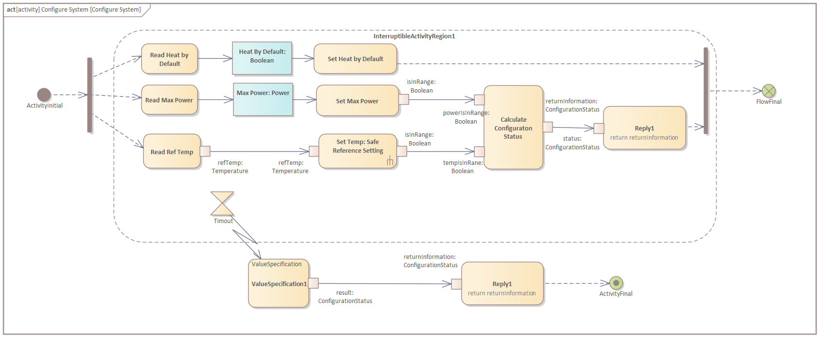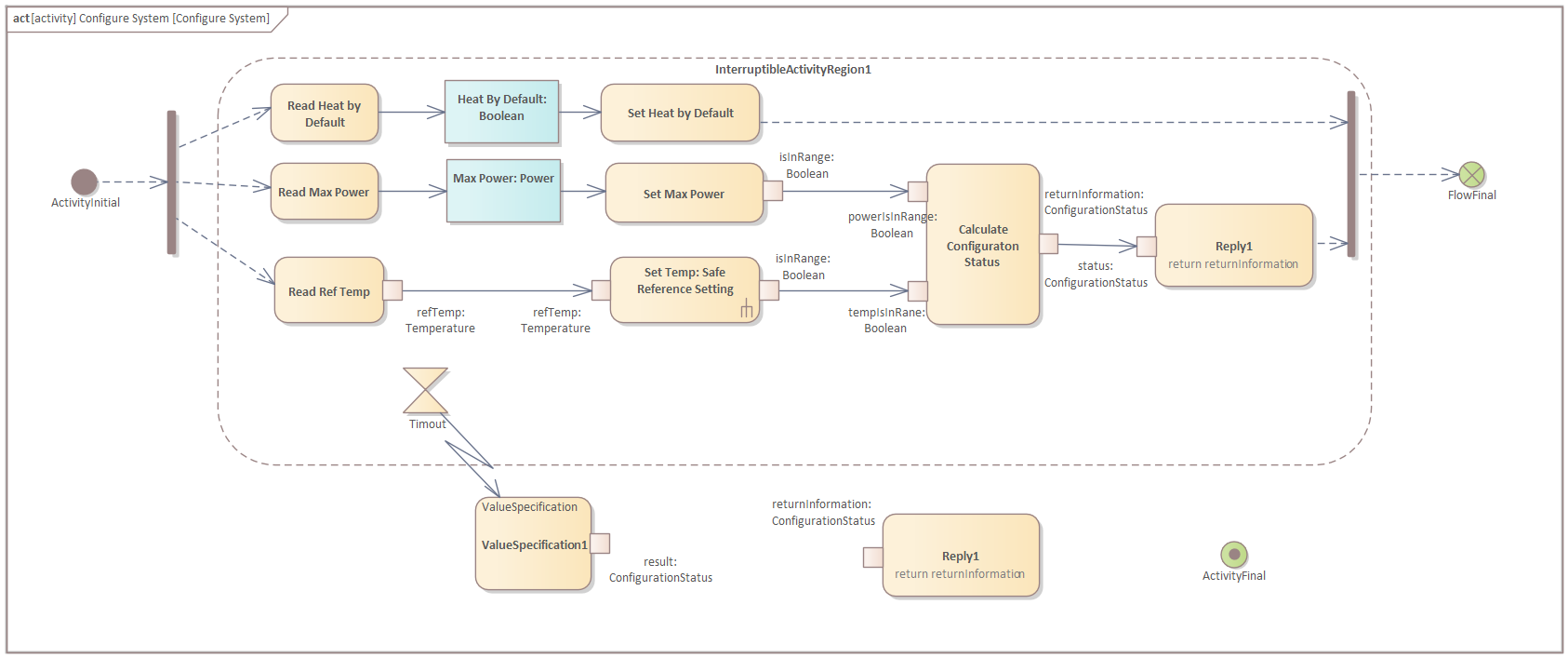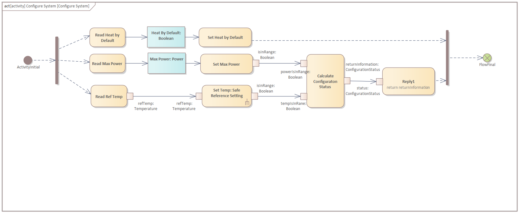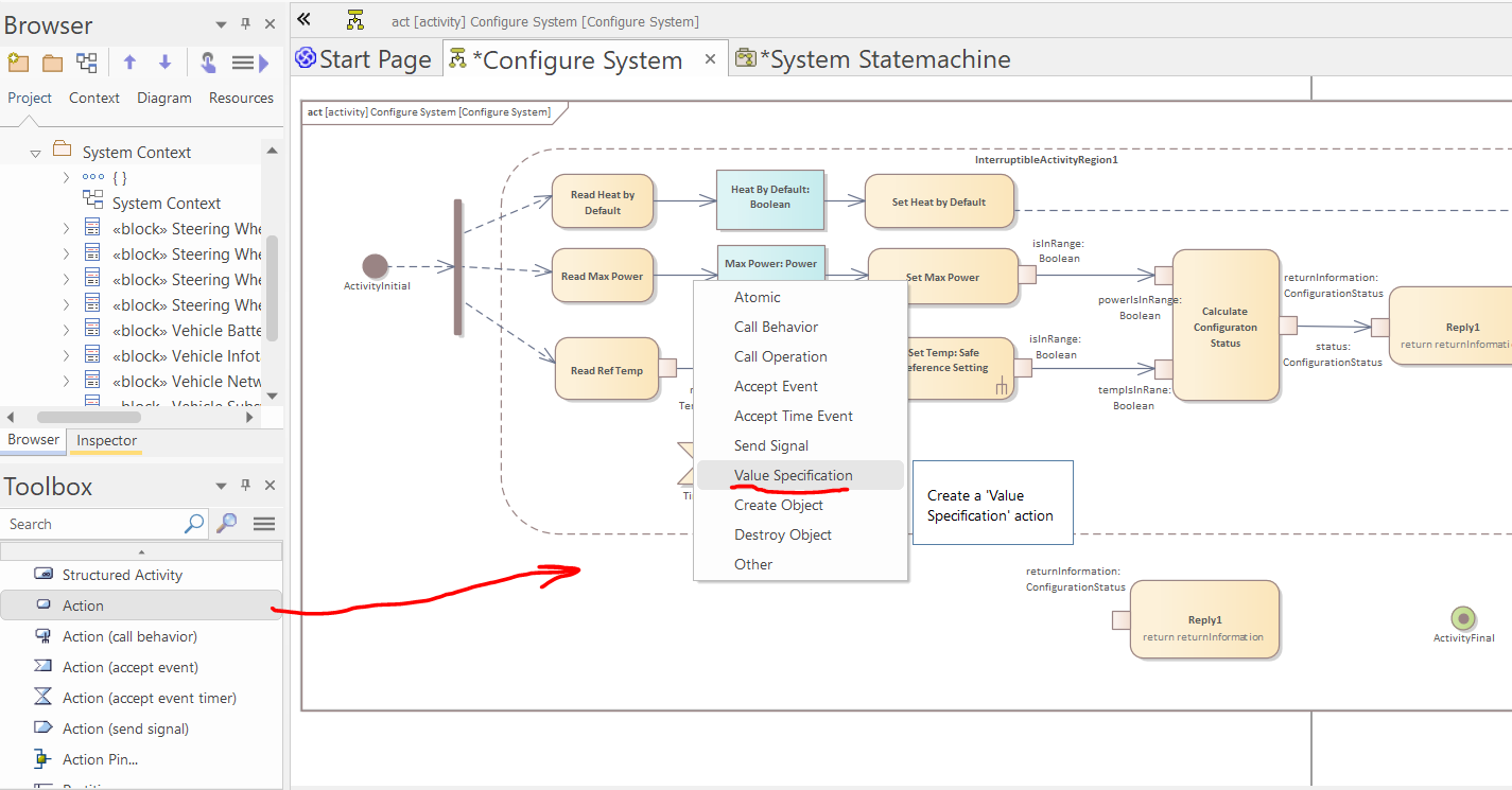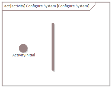 Open the diagram of the "Configure System" activity and create an Activity Initial and a (vertical) Fork node: