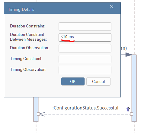 Right-click on the new message and select "Timing details". In the pop-up window, set the "Duration Constraint" to "< 100 us":
