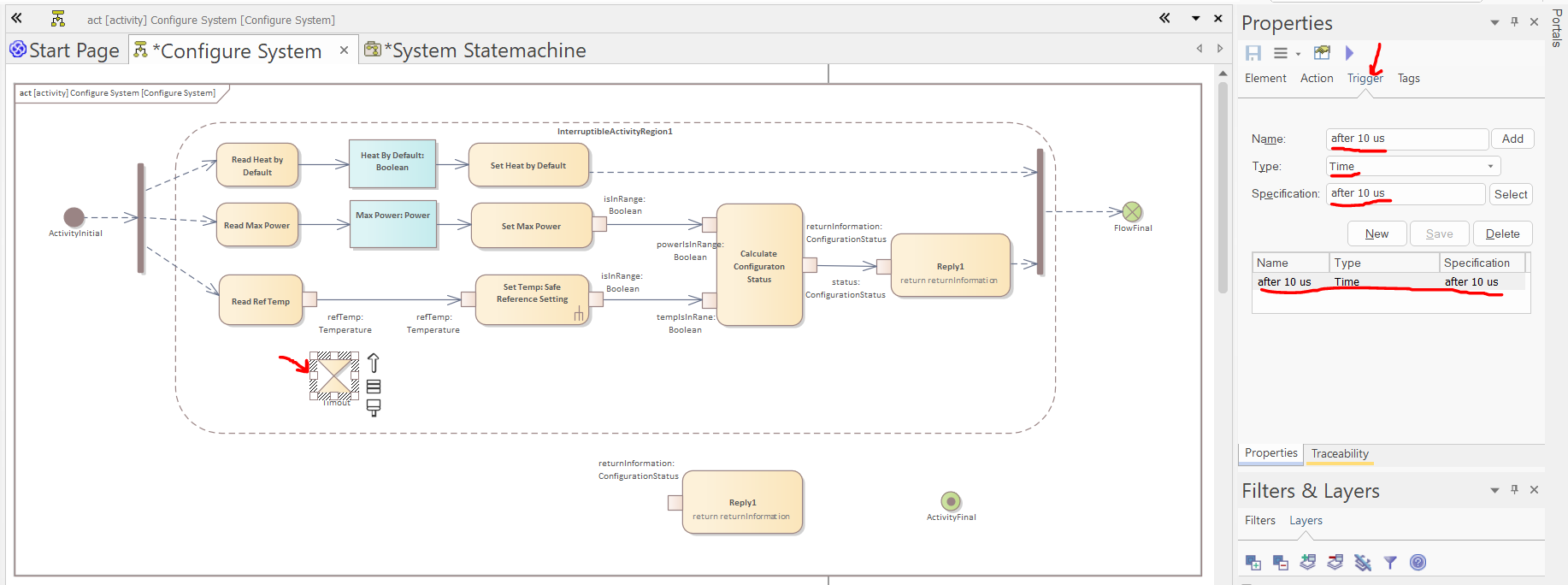 Create a copy of the Reply1 action (CTRL+Drag is the fastest way, but make sure to select the pin as well) and create an Accept Timer Action and a Final activity node.Select the Accept Timer action and in the Trigger tab of the properties window create a new Time trigger with the following specification: "after 10 us".