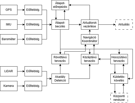 A drón a helyzetének meghatározásához egy IMU-t, egy barométert és egy GPS-t használ. Mindegyik szenzor kimenete átesik egy előfeldolgozási lépésen, amelynek célja zajszűrés, a kalibráció figyelembevétele, és megfelelő mértékegységre konvertálás. Ezek mellett működik egy állapotelőrejelző komponens, amely a legutóbbi becsült állapot és az aktuátoroknak adott vezérlőjelek alapján előrejelzi a következő állapotot a drón mechanikájának matematikai modelljét felhasználva. A legutóbbi ciklusban előrejelzett állapot és az előfeldolgozott mérési adatok egy Kalman-szűrőn alapuló állapotbecslő komponensbe jutnak, amelynek eredményét – azaz a becsült jelenlegi állapotot (fizikai pozíció) – több komponens felé is továbbítjuk. Megkapja a már említett állapotelőrejelző komponens, az aktuátorok vezérléséért felelős komponens, és a tervezésért felelős komponensek. A drón által bejárandó trajektóriát három szinten tervezzük: - Egy hosszútávú tervező komponens az új küldetés megkapásakor meghatároz egy útvonalat a célig, amelyet egyeztet a központi rendszerrel (ahol megtörténik az útvonal légi biztonsági validációja is). Ezen komponens követi az útvonaltervvel való haladást, és adott időnként jelzi azt a küldetéskövetésért felelő komponensnek, amely kommunikál a központi rendszerrel. - Egy középtávú tervező komponens a lokális trajektória megtervezéséért felelős, amely az előre felismert akadályok körüli manővereket tervezi meg, és finomítja a magasszintű útvonal jelenleg releváns szakaszát egy megvalósítható trajektóriára. - Egy rövidtávú tervező komponens felelős a hirtelen elénk kerülő akadályok elkerüléséért, a megtervezett középtávú trajektóriát felülírva vészhelyzeti manőverekkel.