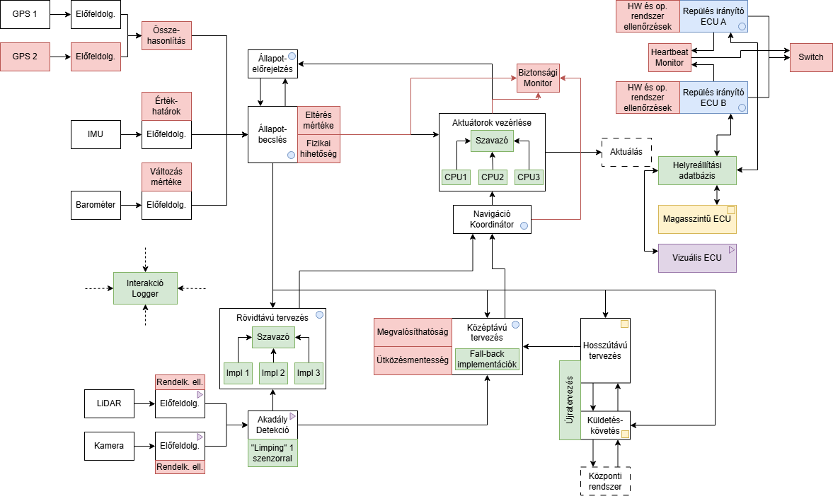A mozgás megtervezéséhez kapcsolódó részfunkciók kódja (kék pöttyel jelölve) a repülés irányító ECU-n fut. Mivel ezen funkciók működése vészhelyzeti leszálláshoz is elengedhetetlen, ezen ECU-ból egy tartalékot is beépítünk. Mindkét példányon a gyártó által beépített HW ellenőrzések futnak induláskor és az alacsonyabb költségűek működés közben folyamatosan, emellett operációs rendszer szintű általános ellenőrzéseket is futtatunk – amennyiben ezen ellenőrzések hibát jeleznek, az ECU kikapcsol. A működő ECU-k folyamatosan életjelet küldenek egy heartbeat monitornak. A monitor jelzi egy tartalékra átállásért felelős komponensnek, ha az elsődleges ECU leállt. A rendszer tartalmaz egy helyreállítási adatbázist, melybe az elsődleges ECU rendszeresen menti az állapotát, így az átállás esetén átmozgatható a másodlagosba.